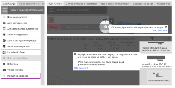 Depois de iniciar sessão na aplicação, o tutorial do software irá guiá-lo através do processo de planeamento da carga.